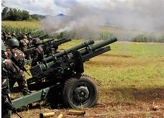 11月27日,在菲律宾棉兰老岛南拉瑙省,菲政府军向反政府武装阵地炮击。 新华社发