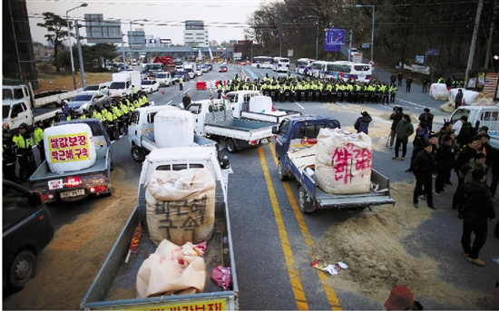 11月25日,在韩国安城,警察封锁道路以阻止抗议者驾驶卡车参加反对总统朴槿惠的集会。 新华社发