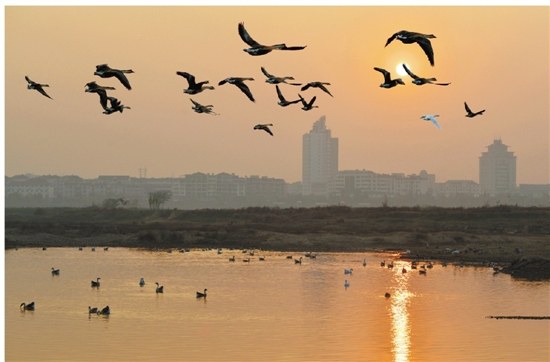 龙游天鹅湖上天鹅飞