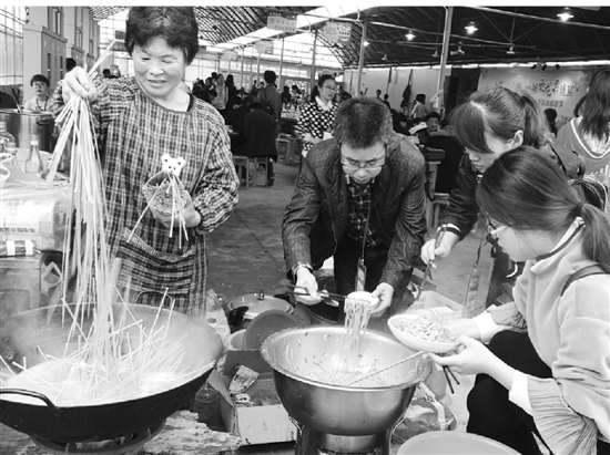 | 火龙果带动休闲游 11月20日,在江山市石门镇秋实家庭农场举办的火龙果休闲旅游节上,几位游客正抢着品尝刚出锅的火龙果面。当日,来自省内外的300多名游客前来参加采摘火龙果、做火龙果宴、寻找福袋等妙趣横生的活动。 (郑积亮 毛凌霄 姜金梅 摄) |