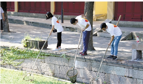 浙江工业大学“一路向阳”实践团第二分队在安昌古镇打捞河道内垃圾