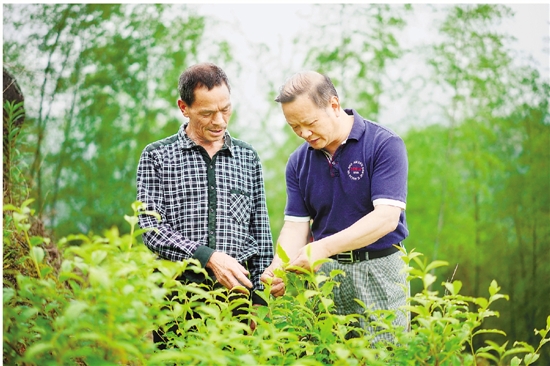 汪自强和农户交流种茶技术(右一)。