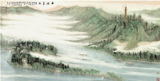 宝石流霞、西泠印社、孤山赏梅……这幅取材于断桥至西泠桥一带最美景致的《西湖翠微》,古迹韵事,令人怀想。古人诗画中的所谓“西村唤渡处”“船向西泠佳处寻”指的都是这里了。画家们用手中的笔,尽情呈现了新时代江山如此多娇、风景这边独好的人文西湖的深厚底蕴。