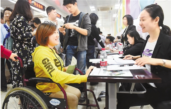 在2016年杭州市高校残疾人毕业生专场招聘会上,许多残疾人毕业生面带微笑和自信从容应聘。 本报记者 吴元峰 通讯员 朱引炜 摄