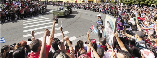 12月3日,运送古巴革命领袖菲德尔·卡斯特罗骨灰的车队抵达古巴圣地亚哥,人们在路边列队送别。 新华社发