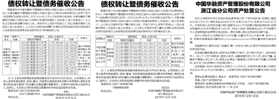 根据邓克川与中国华融资产管理股份有限公司浙江省分公司签订的《债权转让协议》,中国华融资产管理股份有限公司浙江省分公司所合法拥有的本公告项下资产(包括债权及担保从权利),已于2016年12月5日依法转让给邓克川,中国华融资产管理股份有限公司浙江省分公司特公告通知各债务人及担保人(或义务承担人),从公告之日起向邓克川履行相关义务。邓克川作为上述资产的受让人,现公告要求债务人及担保人或义务承担人,从公告之日起向邓克川履行主债权合同及担保合同约定的偿付义务或相应的担保责任或法院判决文书所确定的义务。