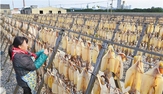 12月11日,舟山市普陀展茅鱿鱼加工市场内,民工们正借助好天气晾晒鱿鱼鲞,以供应内、外销市场。