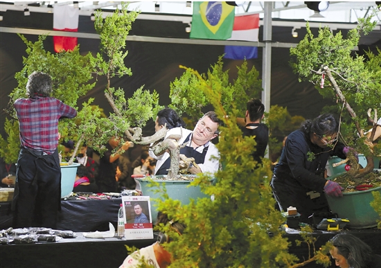 盆栽艺术家齐聚双林现场比拼技艺。 记者 杨新立 摄