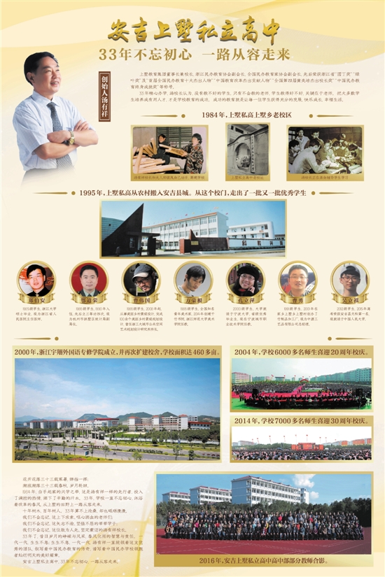 1984年,白手起家的兴学之举,这是汤有祥一样的先行者,投入了满腔的热情,洒下了辛勤的汗水。33年,学校一直不忘初心,沐浴着改革的春风,从上墅的田野上一路从容走来。