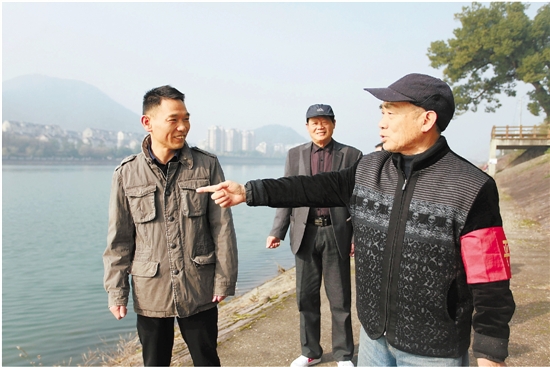 在常山港巡河时,黄小兵(左)向志愿服务队员询问河道保洁情况。 刘琳玲 摄