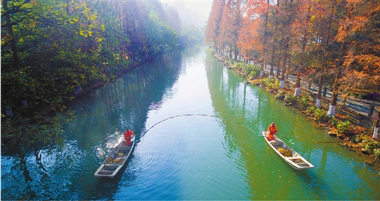 12月17日上午,杭州东河上,两名环卫工人撑着船用拖网打捞漂浮在水面上的落叶,在两岸风光的映衬下,构成了美丽的都市水景。