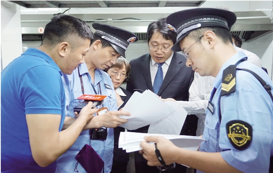 2016年“三大一严”活动中,执法人员现场检查餐饮单位。