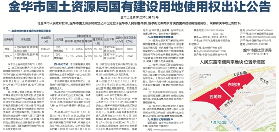 经金华市人民政府批准,金华市国土资源局决定公开出让位于金华市人民东路南侧、旌孝街北侧两宗地块的国有建设用地使用权。现将有关事项公告如下: