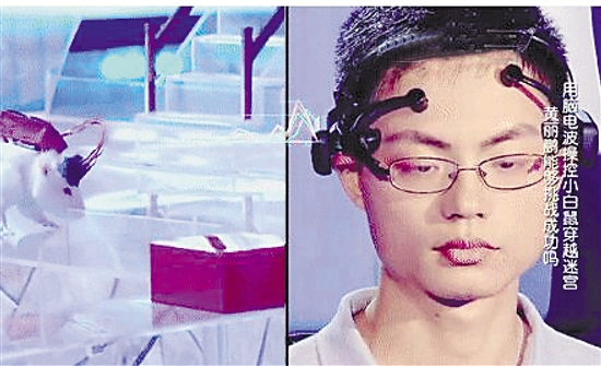 黄丽鹏用脑电波操控大白鼠“小飞侠”。