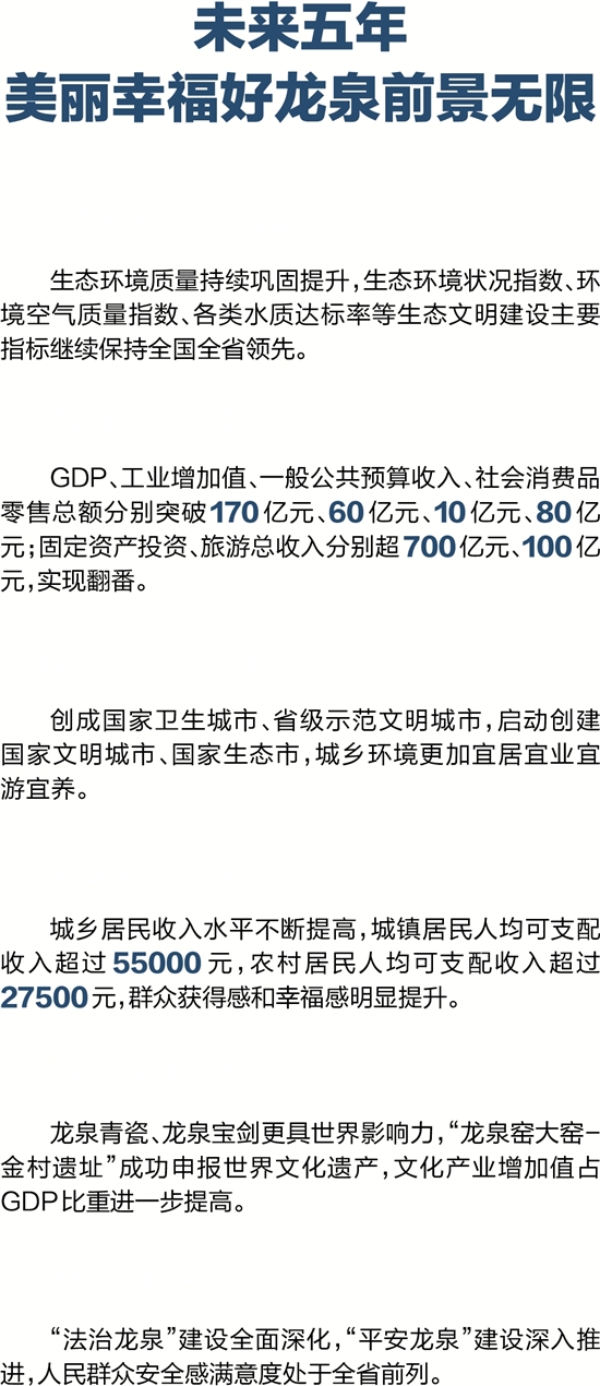 龙泉青瓷、龙泉宝剑更具世界影响力,“龙泉窑大窑-金村遗址”成功申报世界文化遗产,文化产业增加值占GDP比重进一步提高。