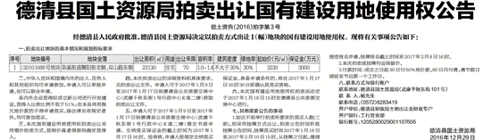德清县国土资源局拍卖出让国有建设用地使用权公告