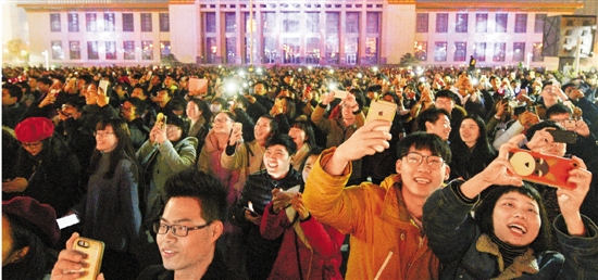 1月1日零时,一群等待跨年的年轻人在杭州武林广场欢呼“2017,欢迎你”,迎接新年的到来。