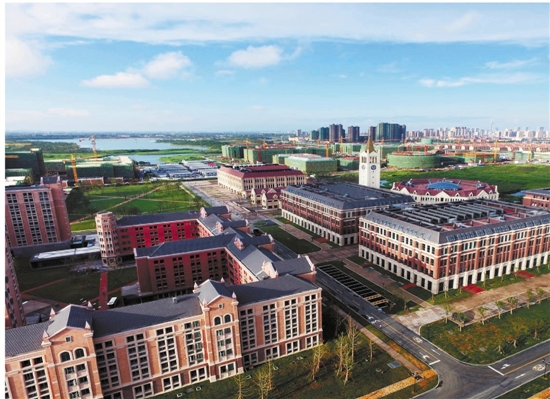 蓝天下,鹃湖北侧的浙江大学国际联合校区(海宁国际校区)十分靓丽。 陈杰 摄