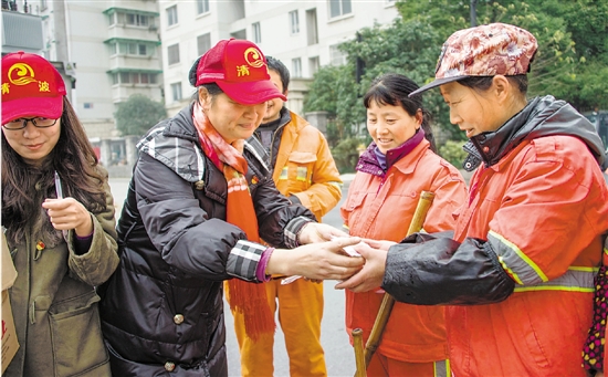 1月4日,腊八节临近,杭州市清波街道党员干部自掏腰包,为社区环卫工人、孤寡老人送上香甜可口的腊八粥,带去党员的一片暖暖心意。