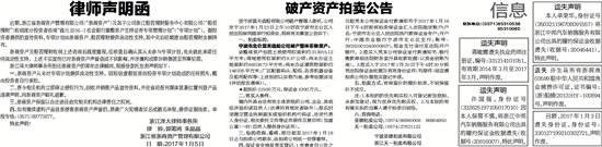 受宁波蓝天造船有限公司破产管理人委托,公司定于2017年1月23日上午10时在宁波市北仑区人民法院审判庭举行拍卖会,现将有关事宜公告如下:
