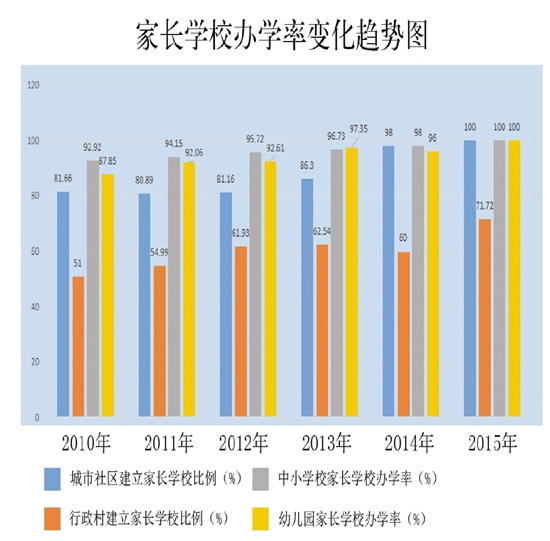——家庭教育指导模式逐步完善。制订出台《衢州市家庭教育工作“十二五”计划》,学校、家庭、社会三位一体的家庭教育指导模式逐步完善。2015年,全市家长学校数达2000所,比2010年多1062所,其中省级家长学校35所,比规划目标多25所。城市社区建立家长学校比例、中小学校家长学校办学率和幼儿园家长学校办学率均已达到100%,行政村建立家长学校比例为71.72%,超过规划目标11.72个百分点。