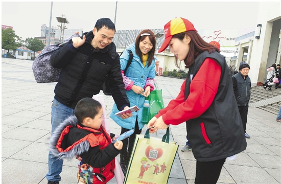 1月8日上午,余姚“大城小爱”志愿服务队一行20人来到余姚火车站,对返乡的外来务工人员提供购票咨询、搬运行李等温馨服务。