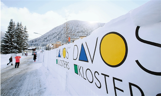 第47届世界经济论坛年会于1月17日至20日在瑞士小镇达沃斯举行。图为1月16日,在达沃斯,行人经过达沃斯宣传标志。