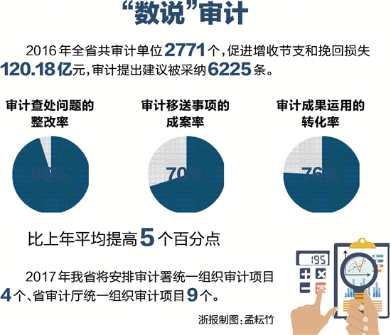 2016年全省共审计单位2771个,促进增收节支和挽回损失120.18亿元,审计提出建议被采纳6225条。
