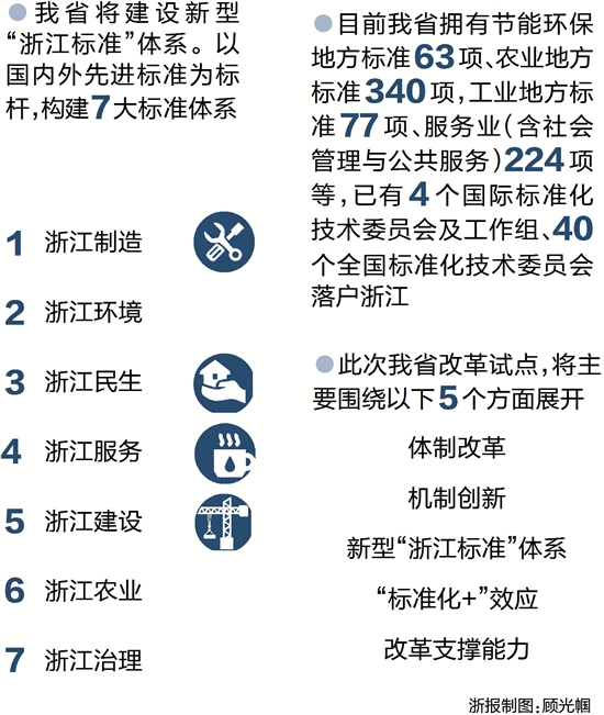 ●我省将建设新型“浙江标准”体系。以国内外先进标准为标杆,构建7大标准体系