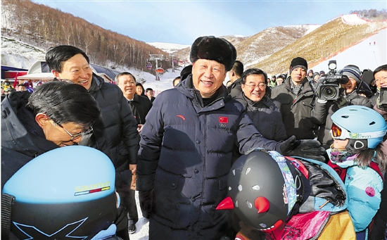 图为习近平在云顶滑雪场亲切勉励参加滑雪冬令营的少年儿童。 新华社记者 兰红光 摄