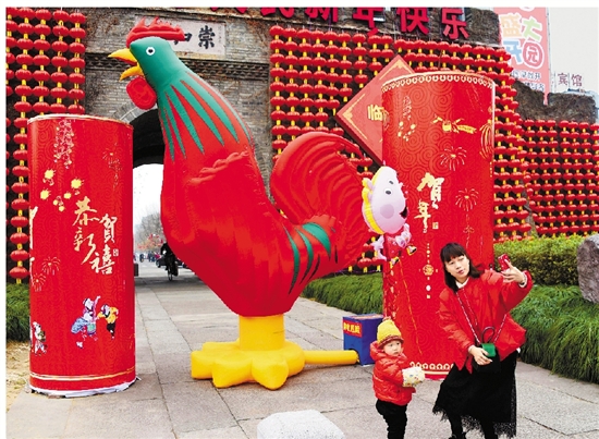 大年初一,游人在临海市崇和门与“大雄鸡”拍照合影。节日期间,临海市街头巷尾张灯结彩,处处洋溢着浓厚的喜庆气氛。 本报通讯员 王华斌 摄