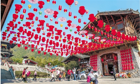 1月29日,在长兴县水口大唐贡茶院内,数千盏花灯高悬楼阁间,吸引了不少外地游客来逛灯会。