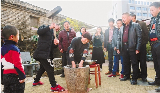 春节期间,不少游客来到“乌石小镇”——磐安县尖山镇品味年俗。图为游客打年糕,体验动手的快乐。 本报记者 傅颖杰 通讯员 张凌宏 摄