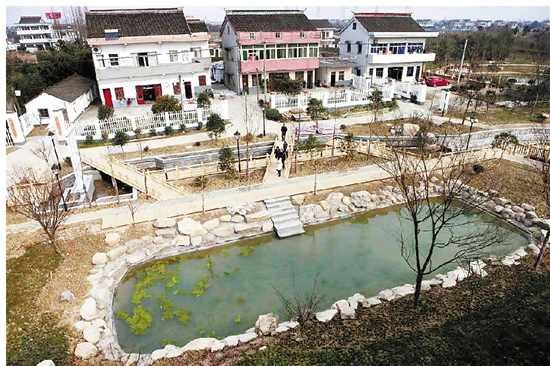 图为利众村农村生活污水生态处理池,池水干净无异味,边上成了一个小公园。