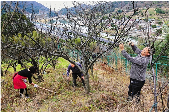 2月3日,舟山市金塘岛树弄村农户忙着为“金塘李”除草整枝,期待今年有个好收成。 姚峰 摄