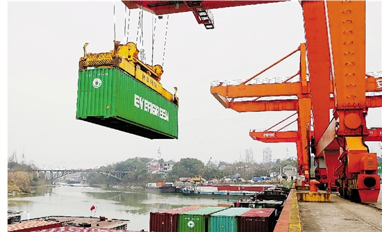 2月3日,在安吉上港码头,吊机正在装卸货船上的集装箱。 钱璐斌 夏鹏飞 摄