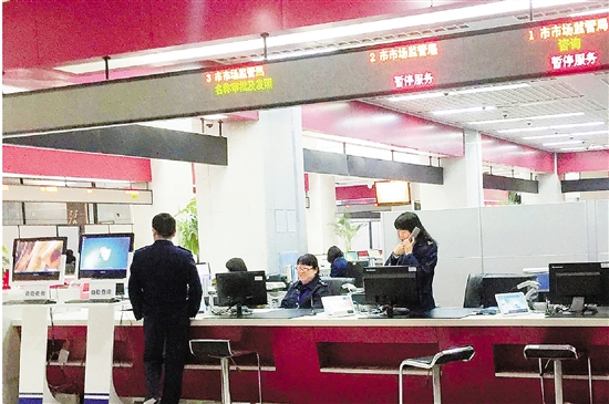 杭州市行政服务中心市场监管局窗口有工作人员聊天。