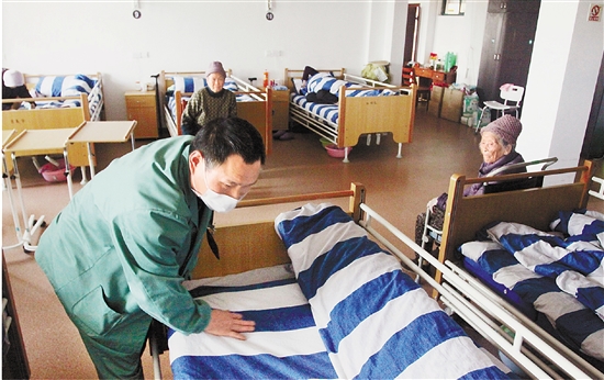 嘉善县西塘镇社会福利养老服务中心工作人员在护理老人。 胡凌翔 周真 摄