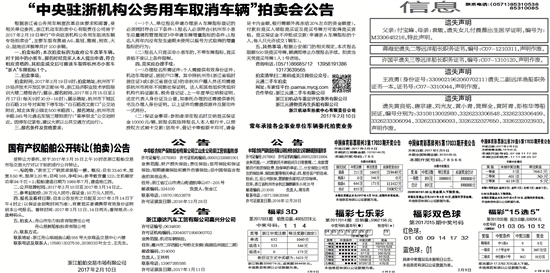 拍卖时间:2017年2月19日9时;拍卖地址:杭州市下沙经济技术开发区学正街66号,浙江经济职业技术学院培训大楼二楼报告厅;展示、报名时间:2017年2月15日至2月17日(每天9时30分~16时);展示地址:杭州市下城区白石路318号对面地下停车场(“白石路西文街口”公交站附近,城北体育公园北500米路西)。报名地址:杭州市沈半路245号元通名车馆三楼拍卖厅(“皋亭坝北”公交站附近。因停车位紧张,建议大家以公共交通方式出行)。