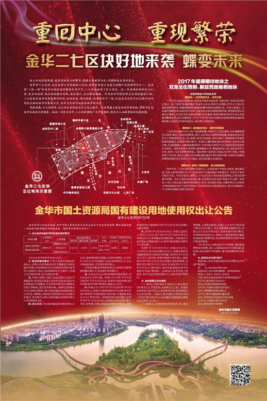 七、至2017年3月6日15时止,申请人达到三人(含三人)以上,则于2017年3月7日9时30分以拍卖方式出让国有建设用地使用权。拍卖地点在金华市公共资源交易中心(金华市双龙南街1698号市工商大楼)。