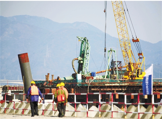 2月12日下午,舟山实华原油码头二期项目45万吨级码头建设工地,一艘大型打桩船正在进行码头系缆墩打桩。该码头工程设计年吞吐量1800万吨,目前码头主体桩基已经完成。 通讯员 姚峰 摄