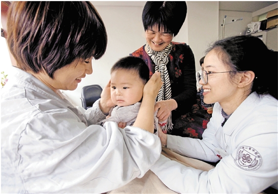 该科充分发挥中医中药特色优势,采用推拿、捏脊、火罐及中药等综合疗法,收到很好的治疗效果。不吃药、不打针、按按揉揉、推推摸摸,小儿们的有些病就好了。这些中医药技术尤其适合5周岁以下婴幼儿,对感冒、咳嗽、鼻塞、流涕、溢奶、夜啼、厌食、腹泻、疳积、斜颈等有显著疗效,发热、遗尿、脑瘫等也可有不同程度的改善。右图为一位七月大的患儿正在接受中医推拿。