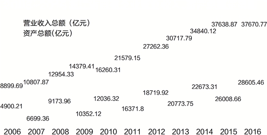 2006-2016浙江省百强企业营业收入、资产总额走势图