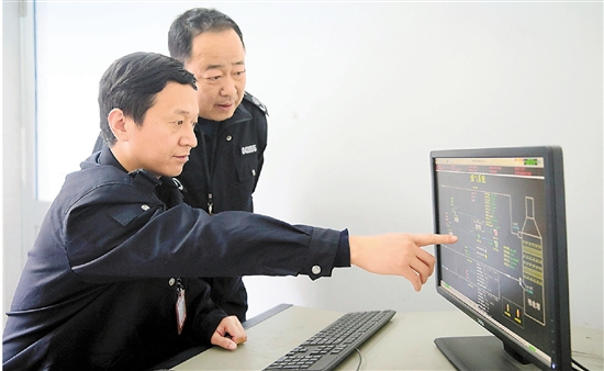 环保执法人员在线查看废气排放数据。 郭斌 摄