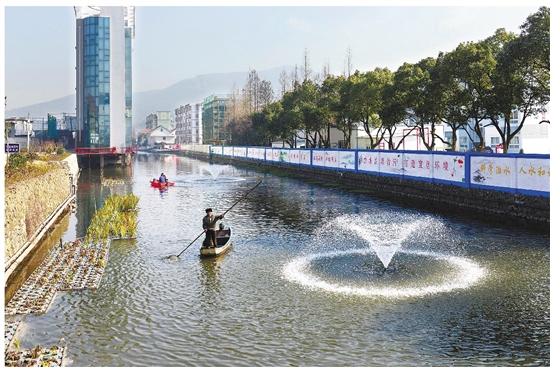 2月14日,一位河道保洁员在舟山市定海区金塘镇沥港老塘河打捞漂浮物。老塘河全长1140米,曾是舟山市重点整治的黑臭河,如今已悄然变样。 通讯员 姚峰 摄