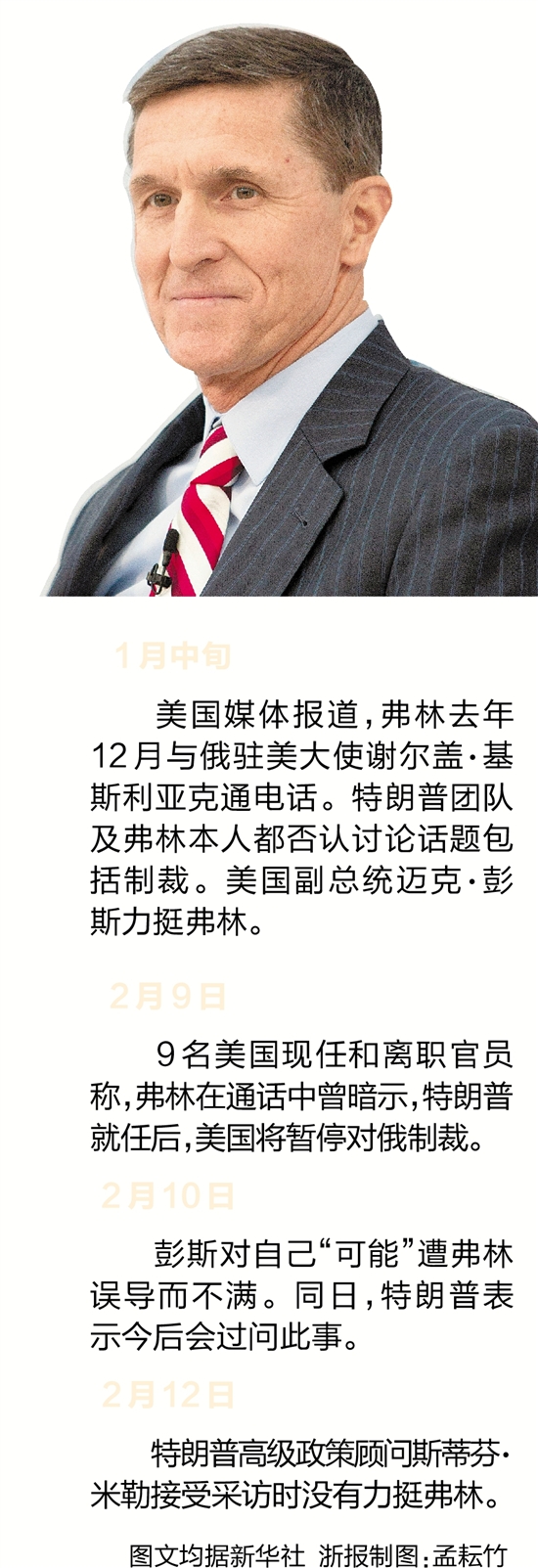美国媒体报道,弗林去年12月与俄驻美大使谢尔盖·基斯利亚克通电话。特朗普团队及弗林本人都否认讨论话题包括制裁。美国副总统迈克·彭斯力挺弗林。