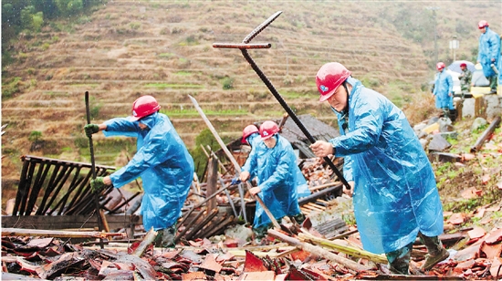 2月23日,景宁畲族自治县“地质灾害综合治理大搬快治三年行动”启动。图为在景宁畲族自治县渤海镇叶处村,工作人员正在拆除地质灾害避让搬迁点的危房,着手灾害点生态恢复。