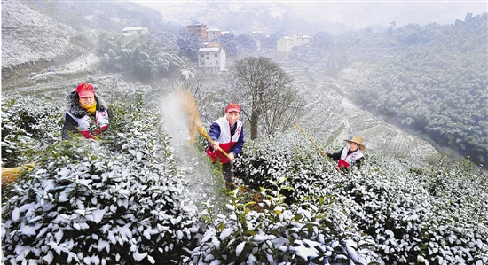 | 2月23日,受强冷空气影响,诸暨市赵家镇海拔600多米的东庄等村下起今春第一场雪,给已发嫩芽的3700多亩早春茶带来较大影响。镇党委、政府迅速组织党员干部和志愿者帮村民清除积雪、减少损失。 通讯员 徐德文 寿瓒 摄 |