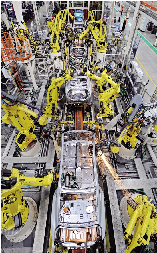 浙江吉利汽车有限公司春晓工厂高度信息化、自动化的车体焊接生产线,其生产的博瑞、博越汽车畅销国内外市场