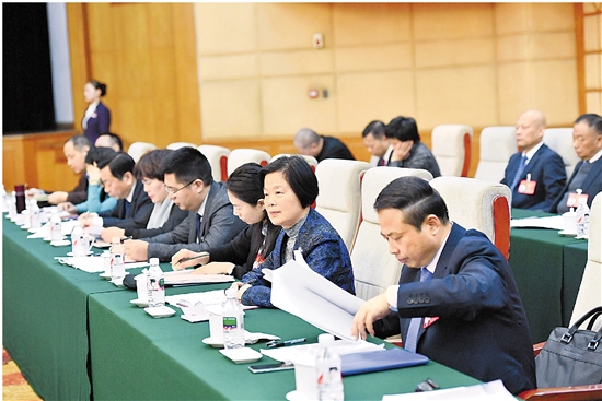 我省全国人大代表认真审议政府工作报告。 本报记者 梁臻 摄